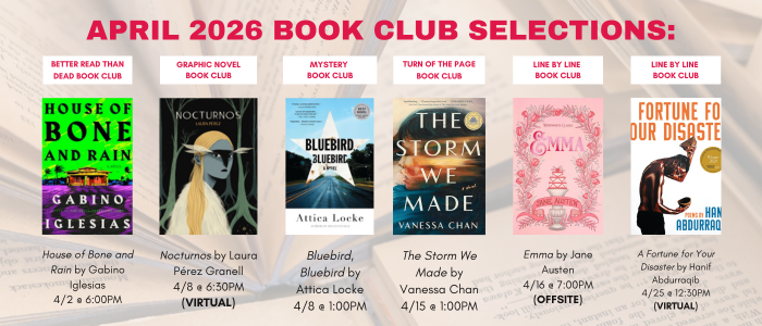 In this book club, we read and discuss books from the mystery, thriller, and horror genres. Explore the haunts of ghosts, vampires, serial killers, murderers, and more!
