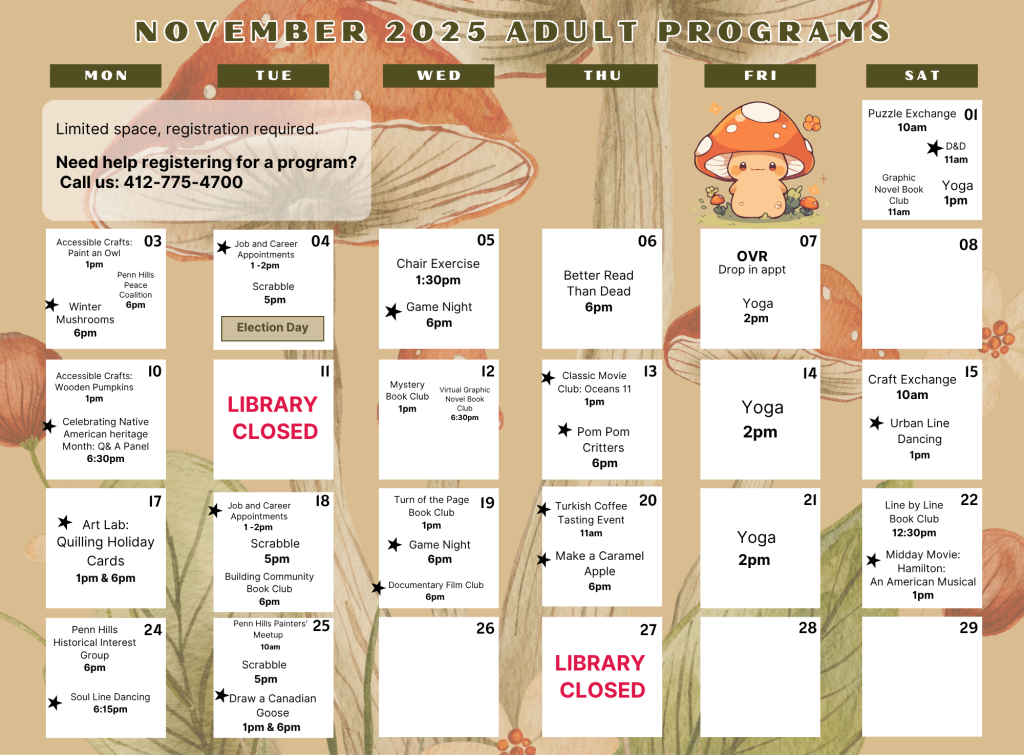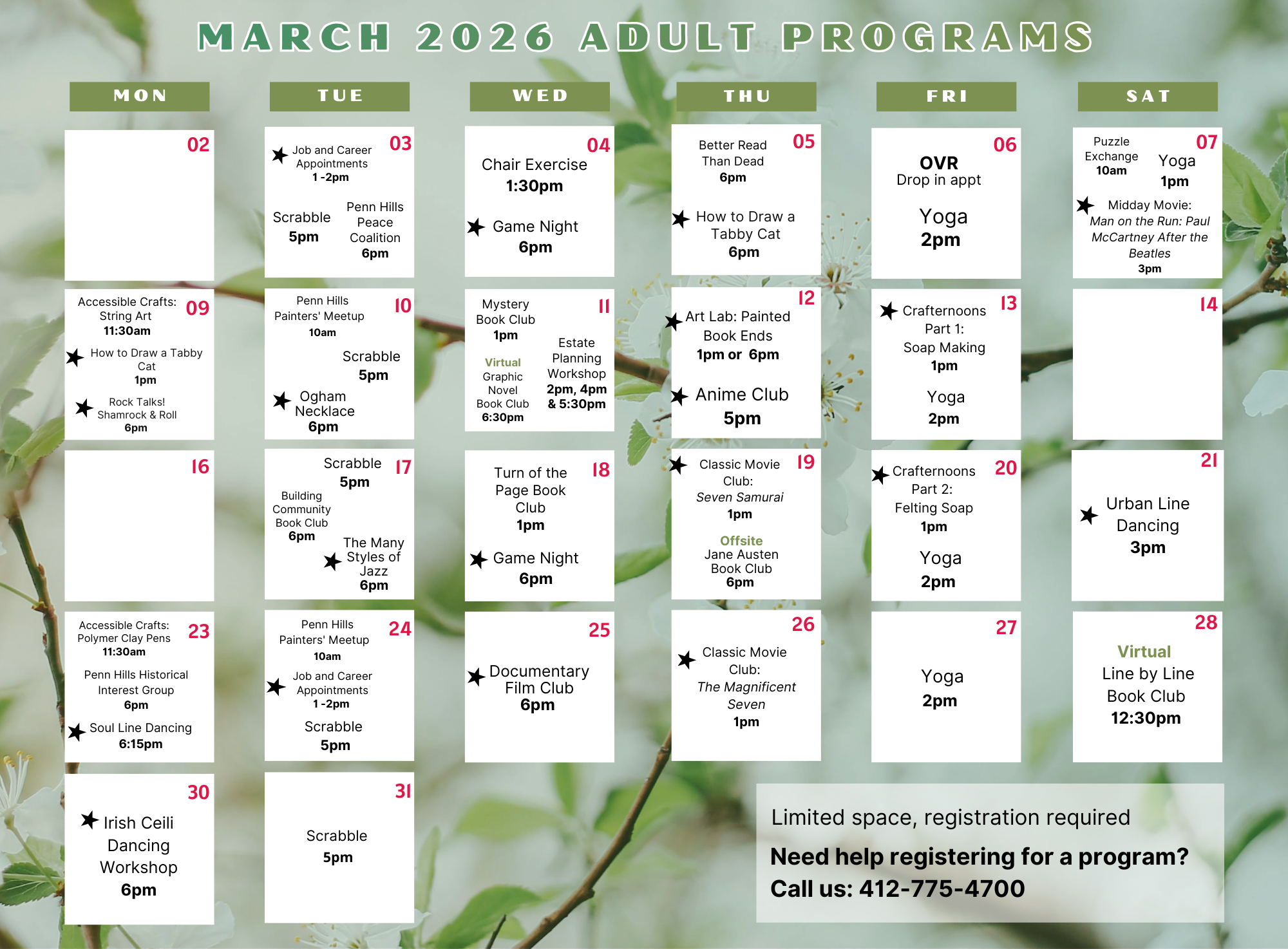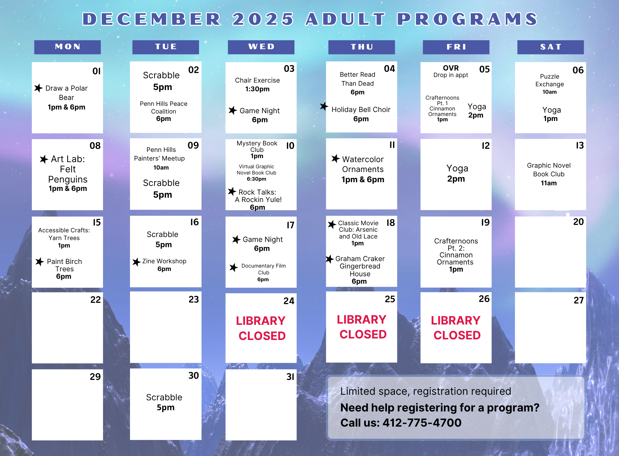 Most programs do not require registration, unless otherwise noted on the calendar. To register for a program, visit the Events List page or call us at 412-775-4700.